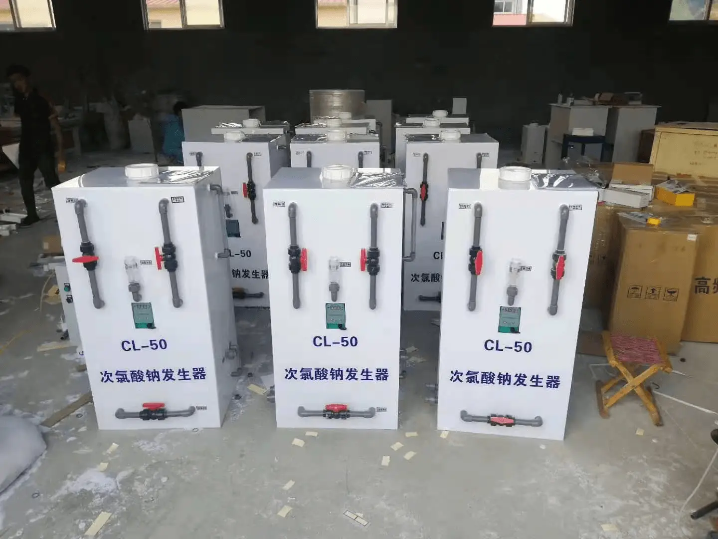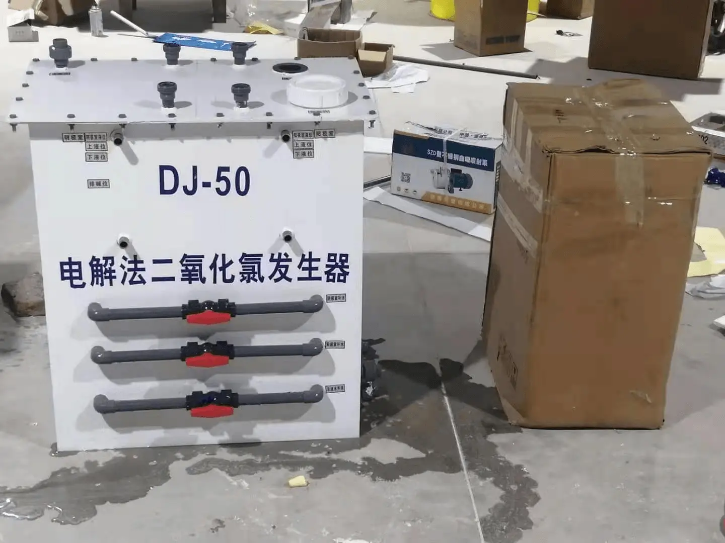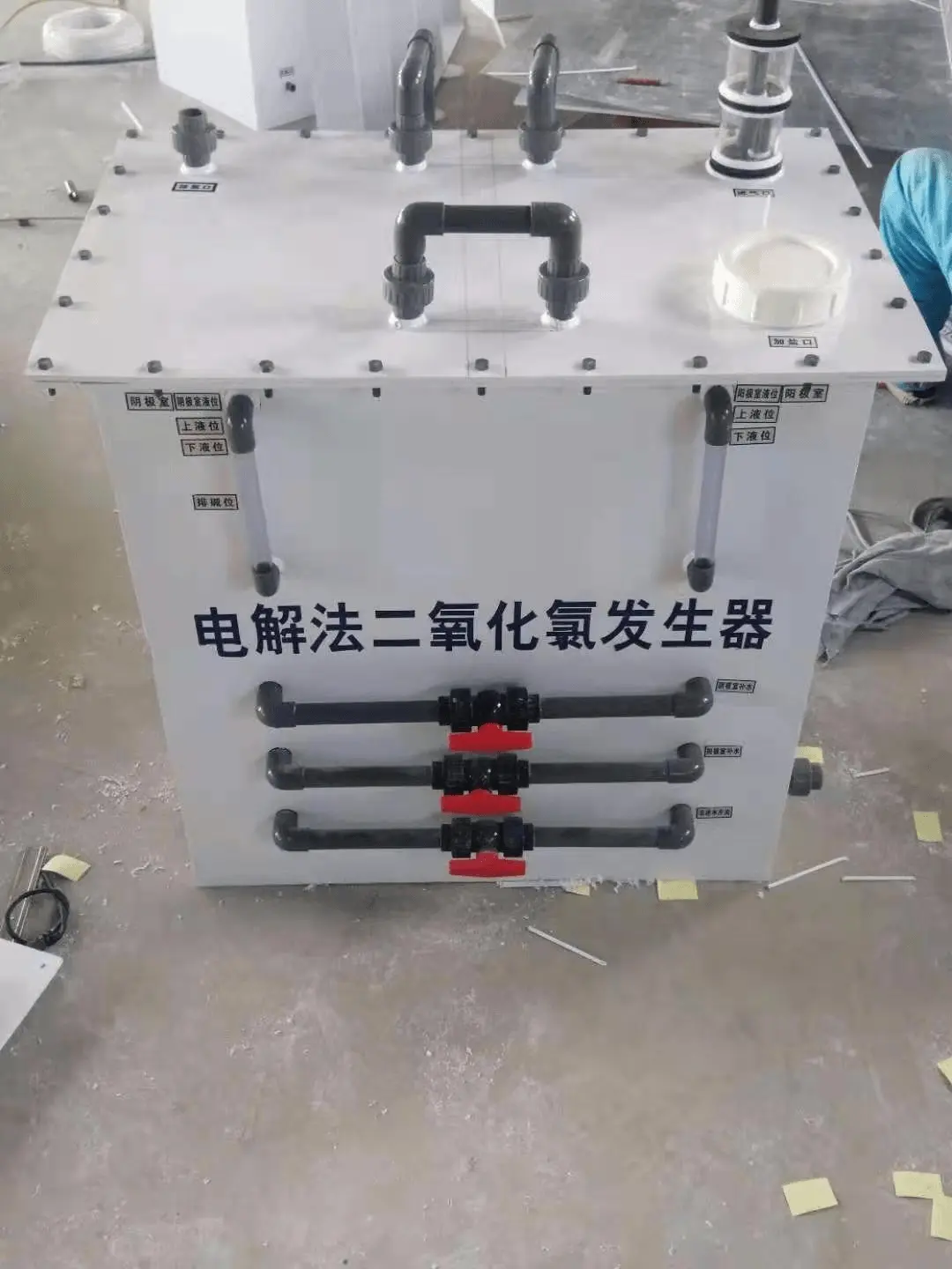 二氧化氯发生器工作原理由计量泵或滴定阀将氯酸钠水溶液与盐酸溶液输入到反应器中,在一定温度和负压下进行充分反应,产出以二氧化氯为主,经水射器吸收与水充分混合后形成消毒液后,通入被消毒水中。