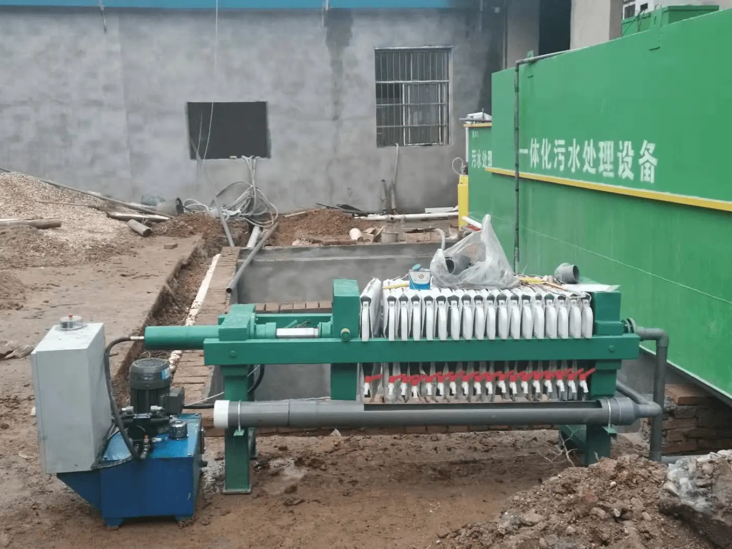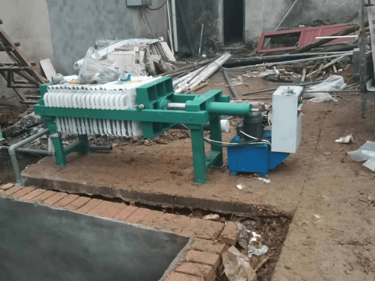 压滤机一般由头板、尾板、滤板、液压缸、主梁、传动及拉开装置等部分组成。液压缸活塞推动头板,使滤板压紧相邻的滤板形成滤室;由泥浆泵将泥浆送入滤室,水透过滤布经排液口排出,固体泥浆在滤室形成滤饼。当泥浆充满滤室后,用高压泵继续对泥浆进行加压过滤,使固液在滤室内分离。